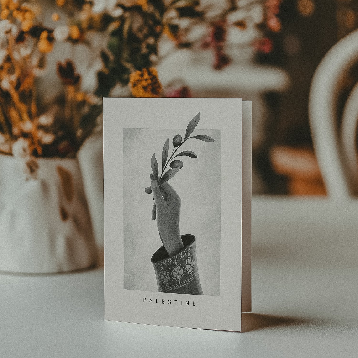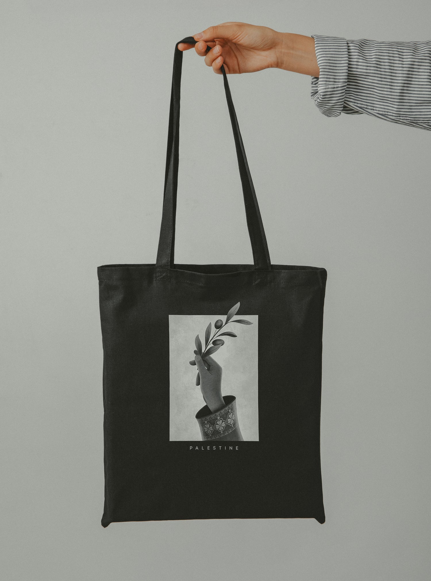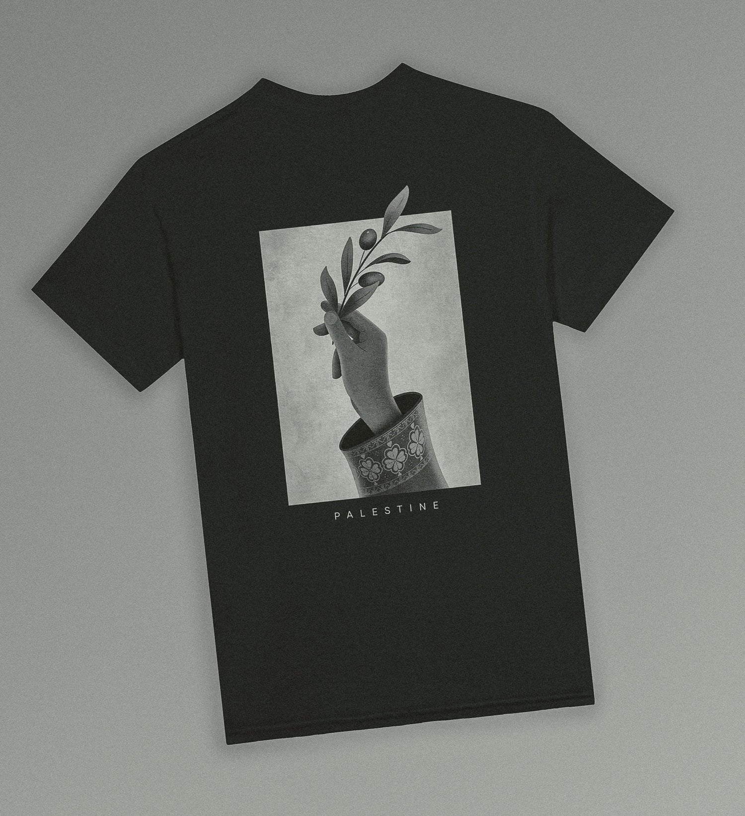Amal — the Arabic word for hope — features an olive branch, a universal symbol of peace, held gently by a woman’s hand adorned with tatreez, the traditional Palestinian embroidery.